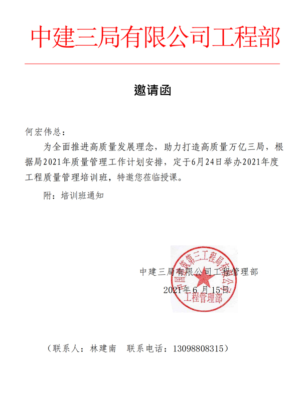 閱讀次數(shù):1618 發(fā)布時間:2021年06月21日2021年6月15日,公司總經(jīng)理兼技術(shù)負(fù)責(zé)人何宏偉受中建三局有限公司工程管理部邀請,參加2021年6月24日舉辦2021年度工程質(zhì)量管理培訓(xùn)班,并在培訓(xùn)班上就施工單位在檢驗和檢測方面應(yīng)注意的問題進行授課。